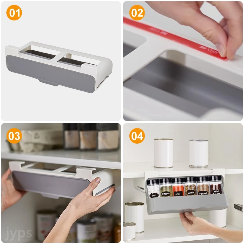 Com espaço de armário muitas vezes em um design premium, o organizador de temperos sob a prateleira utiliza o espaço não utilizado abaixo da prateleira.Possui um compartimento extraível inteligente que acomoda até seis potes de especiarias padrão (não incluídos).